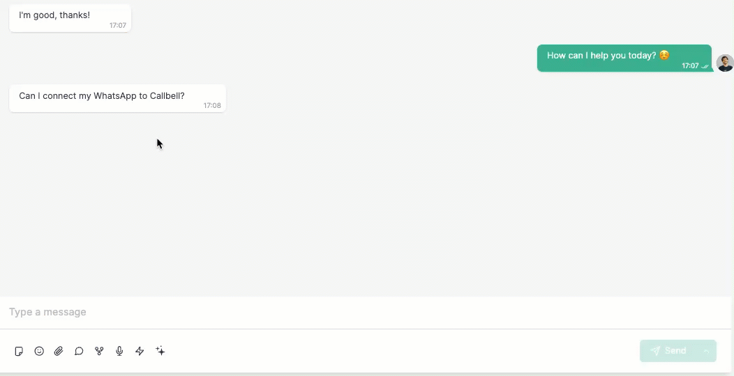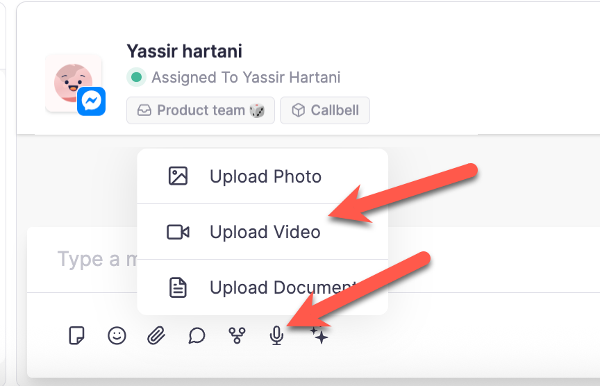 Basta anexar seus vídeos ou gravar áudios para compartilhá-los nos seus chats do Callbell.