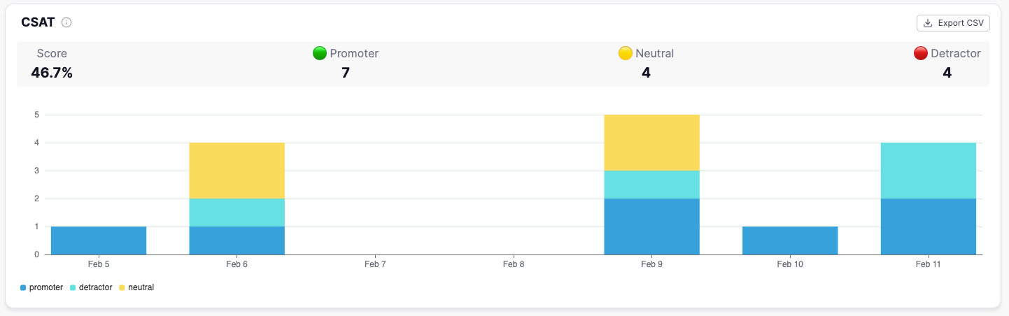 O gráfico mostra o número total de Promotores, Neutros e Detratores. A pontuação CSAT é calculada como a porcentagem de Promotores.