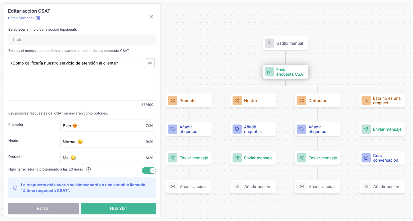 Você pode personalizar totalmente as ações de acompanhamento do CSAT. Recomendamos adicionar uma tag ao chat com base na resposta (Promotor, Neutro ou Detrator) para que você possa segmentar facilmente os clientes para campanhas futuras.