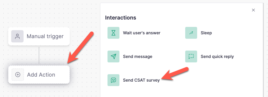 Ao criar ou editar um bot ou automação, adicione uma nova ação e selecione “Enviar pesquisa CSAT”.